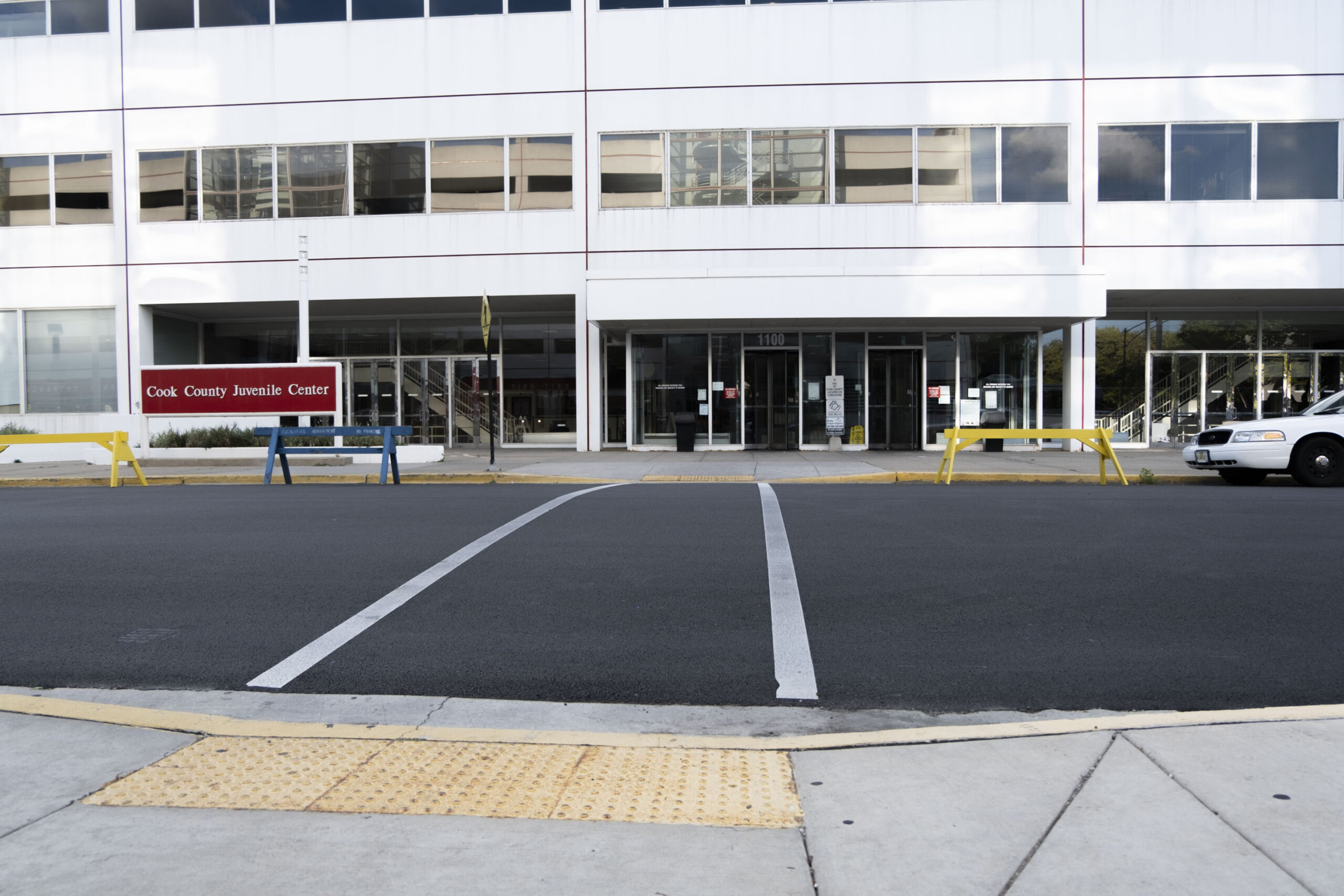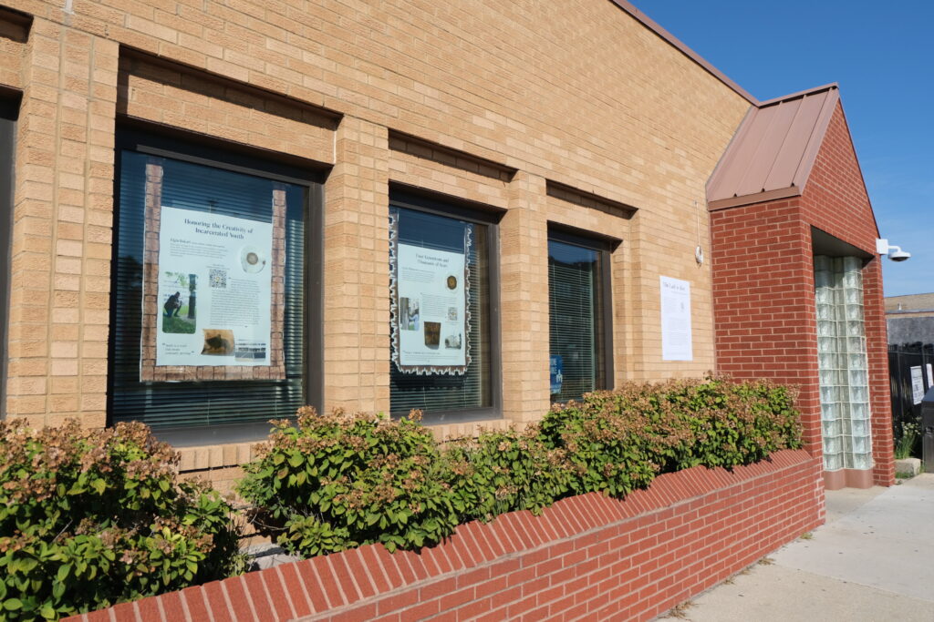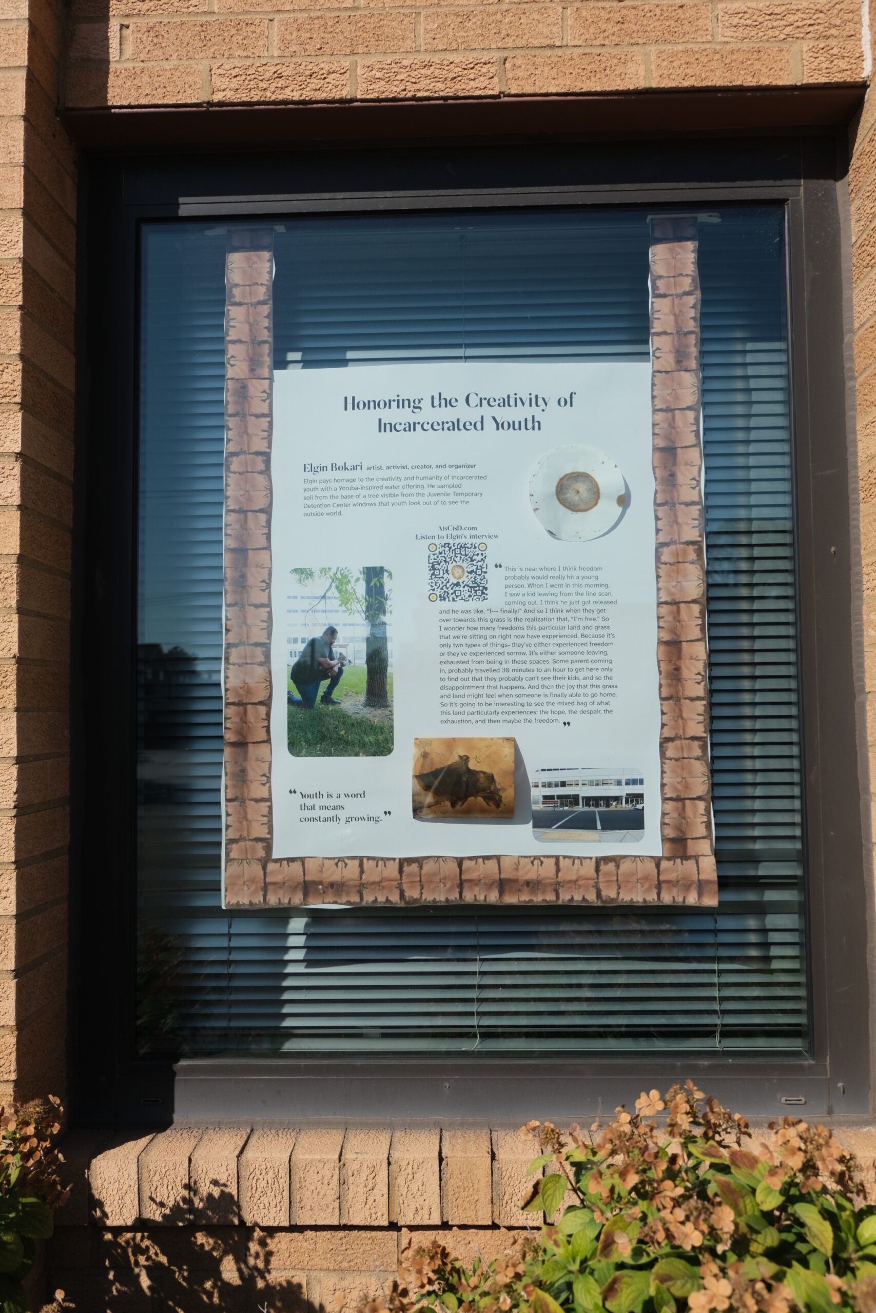 Aside from too little time in the concrete yard, young people can get a glimpse of the outside when they are able to look out of the front windows of the Juvenile Temporary Detention Center. Windows are often seen as portals, and this can be especially true in prisons, “Last week I came in, somebody was banging on a window, trying to talk to someone downstairs.” These same windows that they use for communication also let them glimpse the occasional protestors who rally outside. They also look out onto a strip of grass next to the detention center’s parking garage, where trees are interspersed with surveillance devices atop posts.